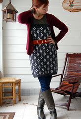 Sweater, Bloch. Shirt, Forever 21. Dress, gift. Belt, gift. Jeggings, Mossimo. Jacket, Laundry by Shelli Segal. Boots, Matisse. Earrings, Claire’s.