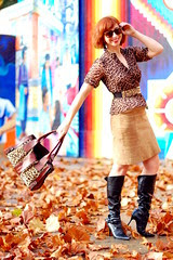 I packed the 30 items (dresses, tops, bottoms, jackets, shoes, bags and a hat) in a box at the end of September. I also included free items: jewelry, scarves, tights, sunglasses, scarves, belts, pajamas, and workout wear. Beefy mailed the giant box to me at the end of October so I was ready to roll on November first. During the month, I swapped out a sweater with a holey armpit for a ruffled, leopard miniskirt and traded my blogoversary jacket for shorty cowboy boots with a fabric upper.
